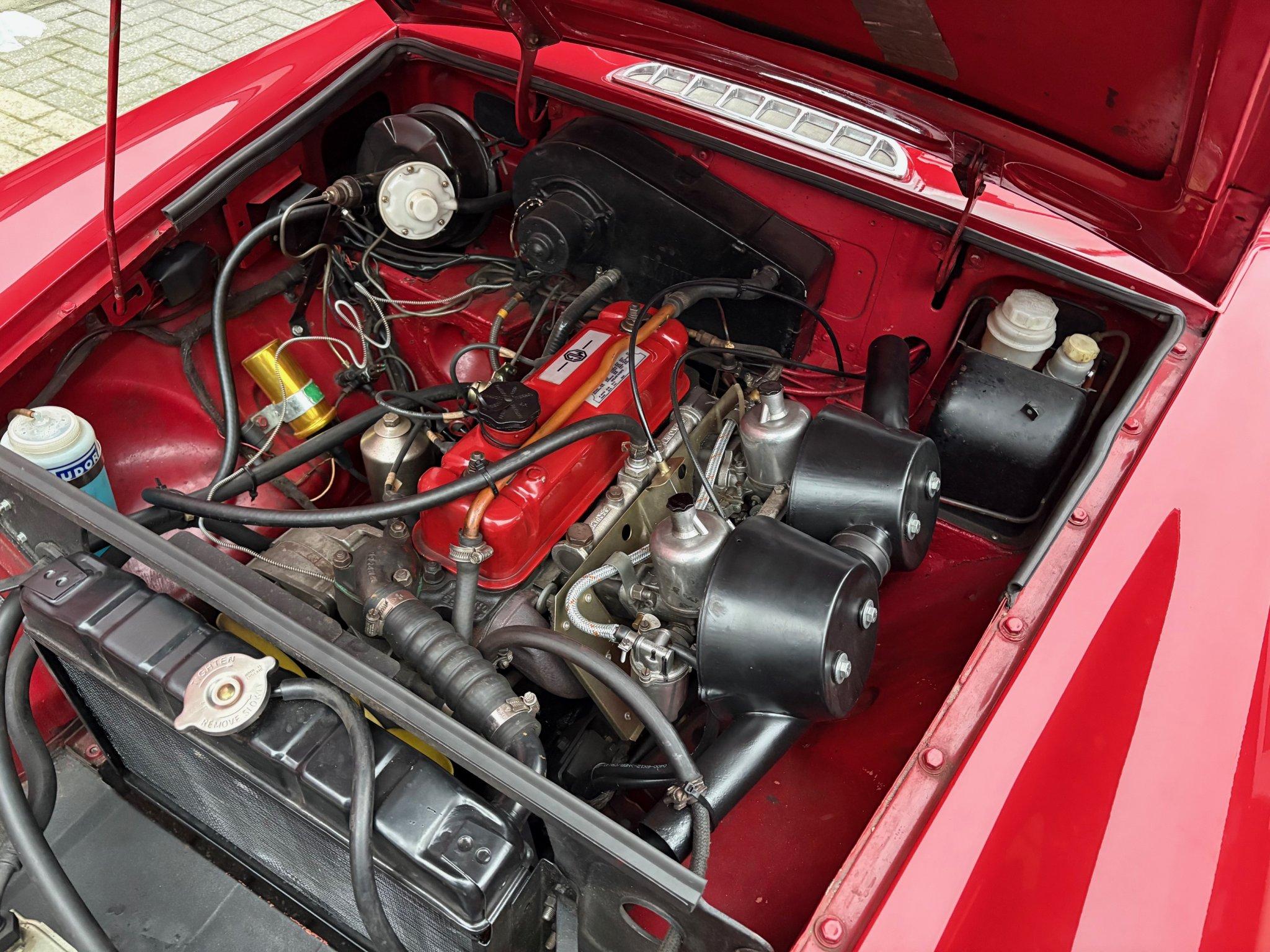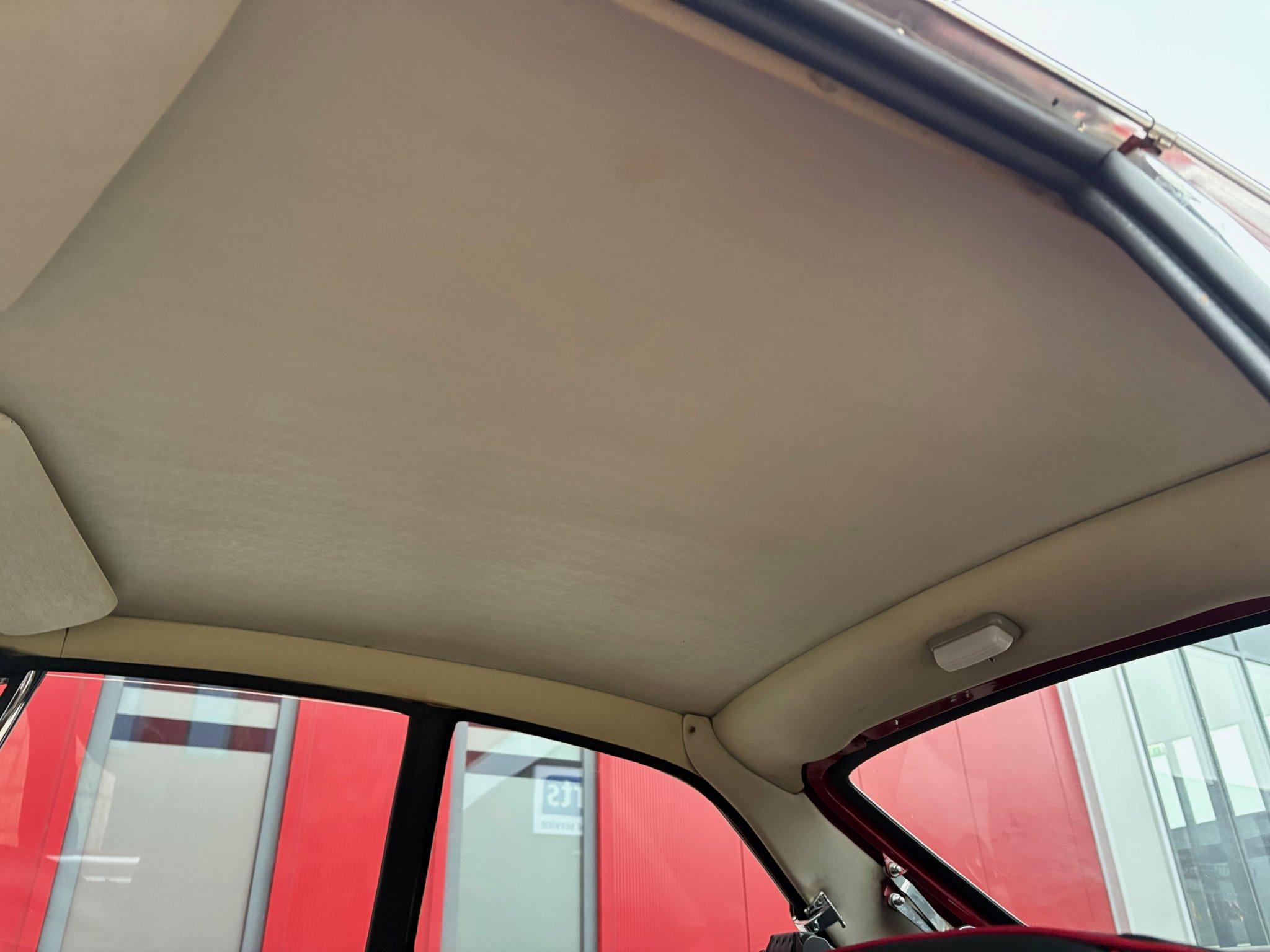 Kleur Tartan Red met een zwart interieur met rode bies. Zwarte vloerbekleding en een nette schone witte hemelbekleding.