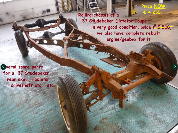 For sale rolling chassis of a 1937 Studebaker Dictator with possibly complete engine available. We also have parts such as rear axle, radiator and drive shaft. Ideal as a donor or basis for a hotrod or special. The chassis is in original condition. Price for the chassis: € 4250.- Big choice in REAL Classic Cars in the Stolze Collection ! From a project to perfect.
