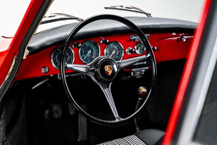 The exterior was repainted in 2024 by WRG Body Shop in Charlotte, NC, a professional refinish that shows excellent quality throughout. While the car's original factory color showed evidence of Smyrna Green, the current finish appears to honor Porsche's Signal Red...a bold, era-correct hue that suits the lines and personality of the 356 beautifully. Trim pieces, lighting, and lenses all appear to be original or authentic components, wearing a expected level of patina, free of major damage or aftermarket substitutions. Tasteful period touches like the rear luggage rack, headlight grills, and grey steel wheels with polished chrome hubcaps round out the classic Porsche look. The car rides on a set of Vredestein Sprint Classic tires, a fitting choice for vintage aesthetics and capable modern drivability.