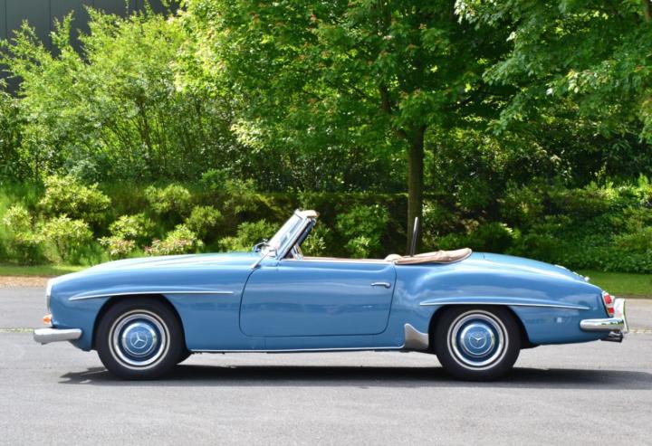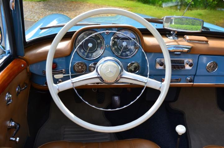 De 190 SL heeft een betrouwbare viercilinder lijnmotor van 1.9 liter in het vooronder die meer dan 100 pk aan vermogen opbrengt. De vierversnellingsbak schakelt soepel en de achterwiel aangedreven auto laat zich levendig besturen.