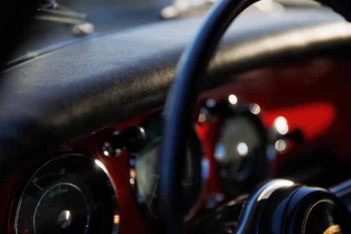 Under its most recent owner, the Super 90 GT was the recipient of a cosmetic and mechanical restoration between 2020 and 2022. There are numerous Carrera GT items to note- including the oil line holes in the passenger side fender well where the feed and return lines to the oil cooler would reside in a four-cam engine-equipped Carrera GT. The aluminum panels open and close smoothly, and the GT engine lid includes the internal ducting designed for the four-cam Carrera motor. Riveted bi-metal KPZ wheels are present and include a matching spare at the front trunk compartment, alongside the correctly finished GT fuel tank, fittings, and jack. In the cabin, care was taken to select materials that were correct to the original specification, including the black leatherette and corduroy upholstery over aluminum GT seats and the back factory roll bar.