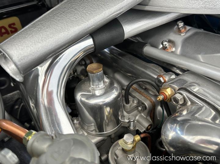 The MKII’s matching-numbers 3.8-liter engine was completely rebuilt and tested on our engine station before installation, and the restoration also included a conversion to a 5-speed transmission, and full refurbishment of the fuel, electrical, cooling, and hydraulic systems. The car’s chrome was re-plated as needed, and numerous upgrades were integrated to improve driveability and comfort while preserving the car’s classic appeal.