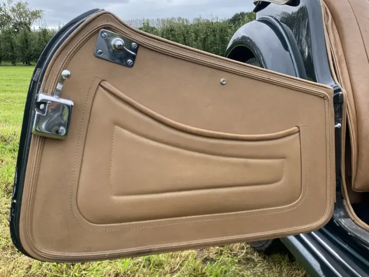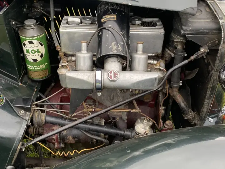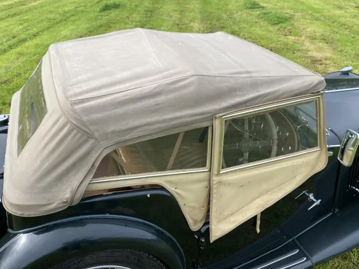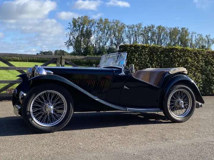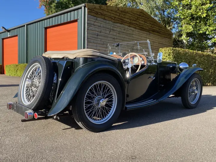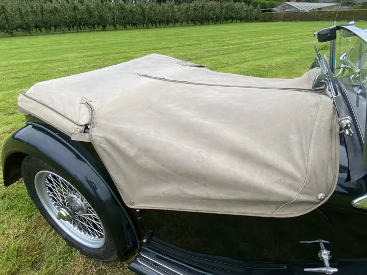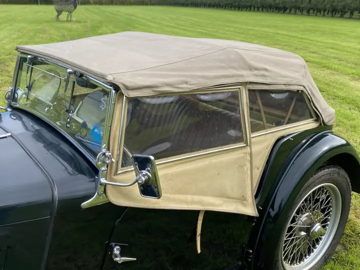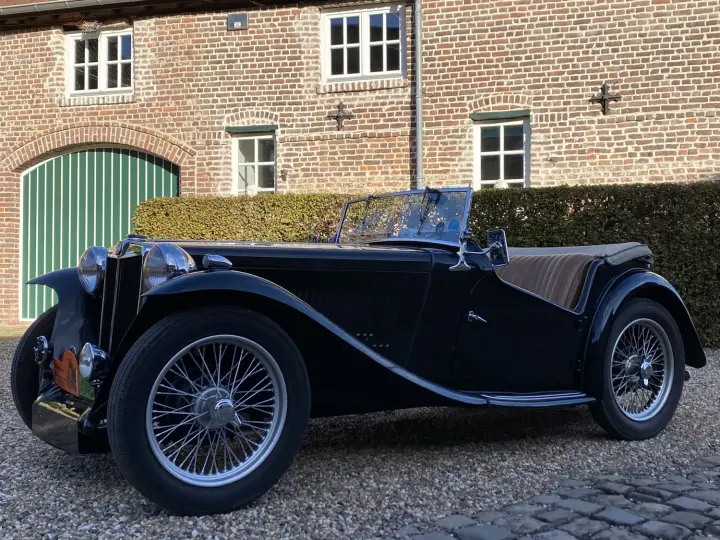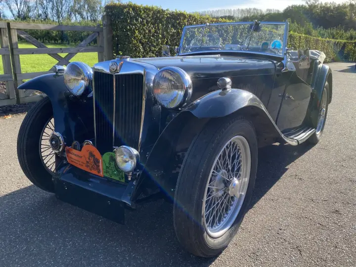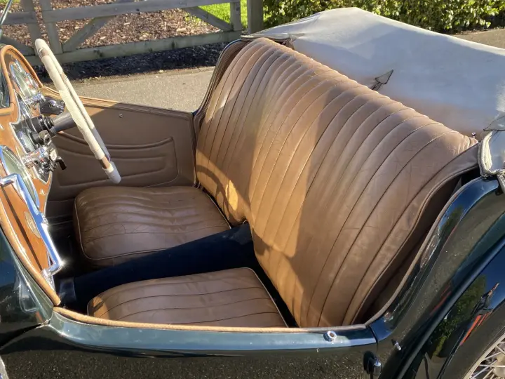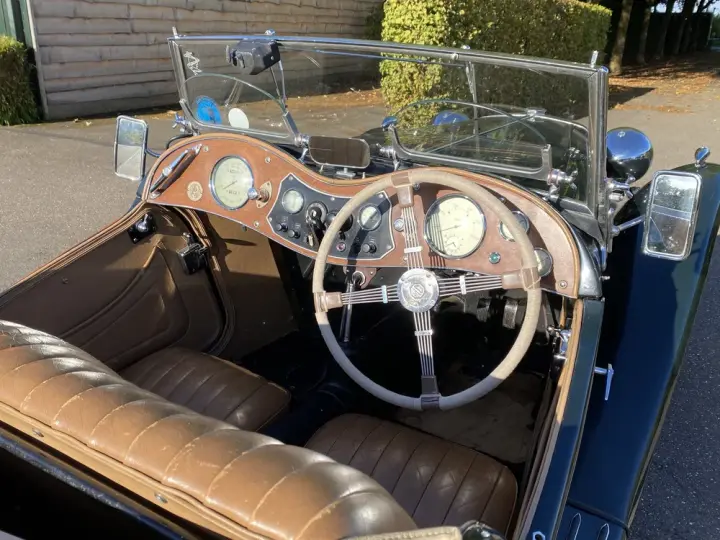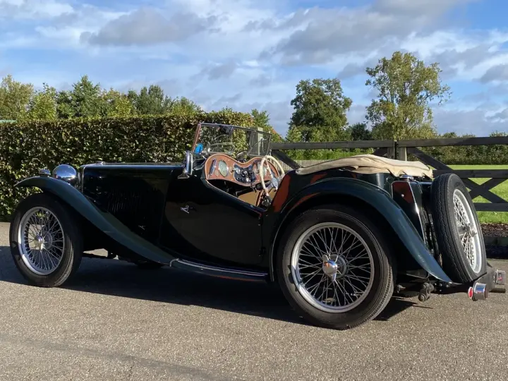 MG TC de 1947 en couleur vert foncé et intérieur cuir marron. Cette MG TC est particulièrement soignée car elle est toujours dans son état d'origine. La carrosserie est impeccable et la peinture est encore en bon état. Le châssis est exempt de rouille. Cette TC a été vendue neuve à un concessionnaire MG au Venezuela mais elle a été immatriculée et roule en Belgique depuis plus de 20 ans. L'ancien propriétaire a pris grand soin de sa voiture comme vous pouvez le voir sur les photos. Il tenait particulièrement à garder la voiture aussi originale que possible. L'intérieur en cuir brun est toujours en excellent état ainsi que l'aspect général de l'intérieur. Tous les indicateurs Jeager sont fonctionnels et ont leur place dans le tableau de bord en bois. Techniquement, la voiture est parfaite ! Elle démarre immédiatement et fonctionne très bien. L’année dernière, le moteur a fait l'objet d'un entretien et d'une inspection complète.