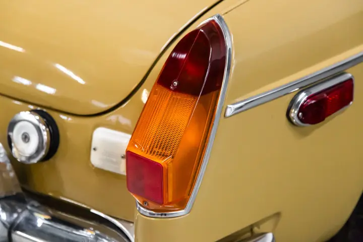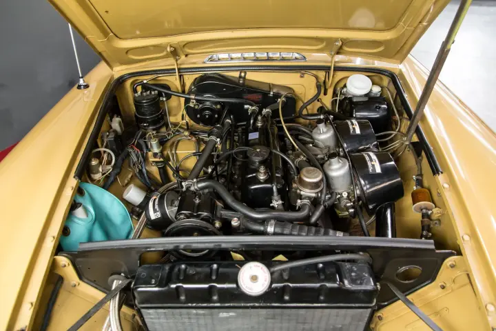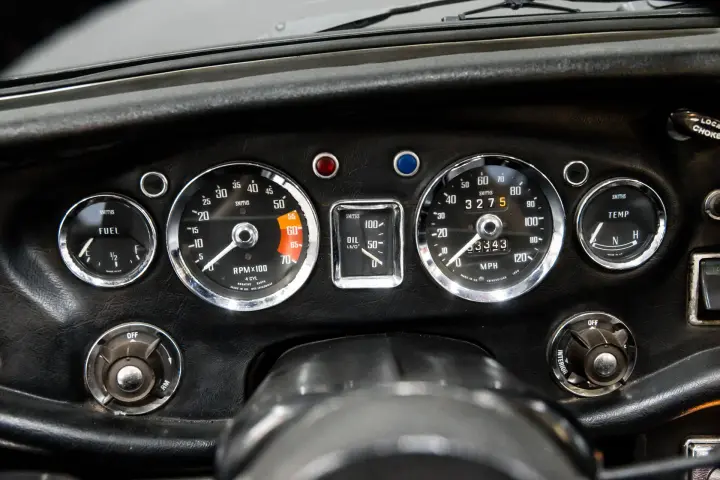 This car is tight in the suspension, with a quiet transmission, and smooth overdrive. Brakes are in good order ,the tires are deep in tread. The instrumentation gauges are clean ,crisp ,and work as designed .All electrical are in good working order .Chrome and bright work is in excellent condition .Seats sit full and in good condition, carpets are good, door cards are straight, soft top is in good condition.