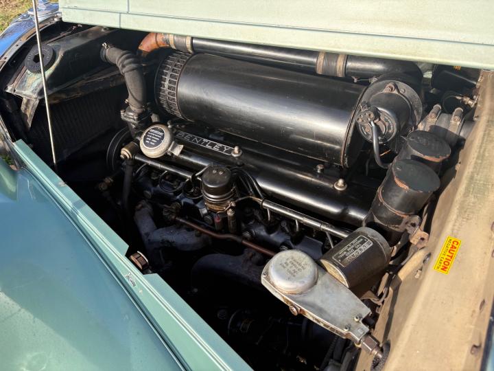 Deze Bentley werd ooit in Amerika opnieuw gespoten en dat is niet perfect, maar wel goed gedaan. Het geklonken chassis en de onderkant van de auto zijn niet behandeld en zeer origineel en gaaf.