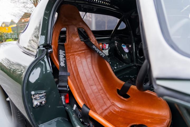 Interior: Tillet B6 seat trimmed in tan leather (dated until 2026), Lifeline harness (dated until 2026), and fire extinguisher (next service due April 2025).