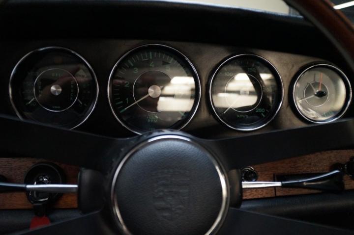 The exterior carries its striking Light Ivory and gold detailing with understated confidence. Inside, the cabin balances period-correct sportiness with timeless elegance. A beautiful wooden steering wheel and matching wooden interior trim set the tone, while the original black leather provides an authentic foundation. Period-correct Recaro racing seats with pepita inserts and an “Autoflug” racing harness complete the package – details that speak directly to Porsche’s motorsport DNA.