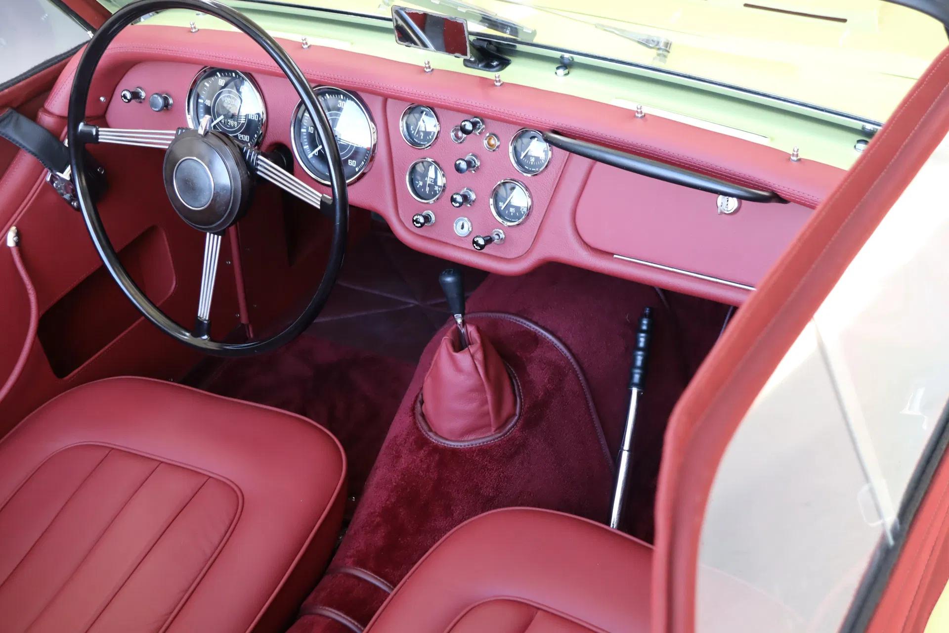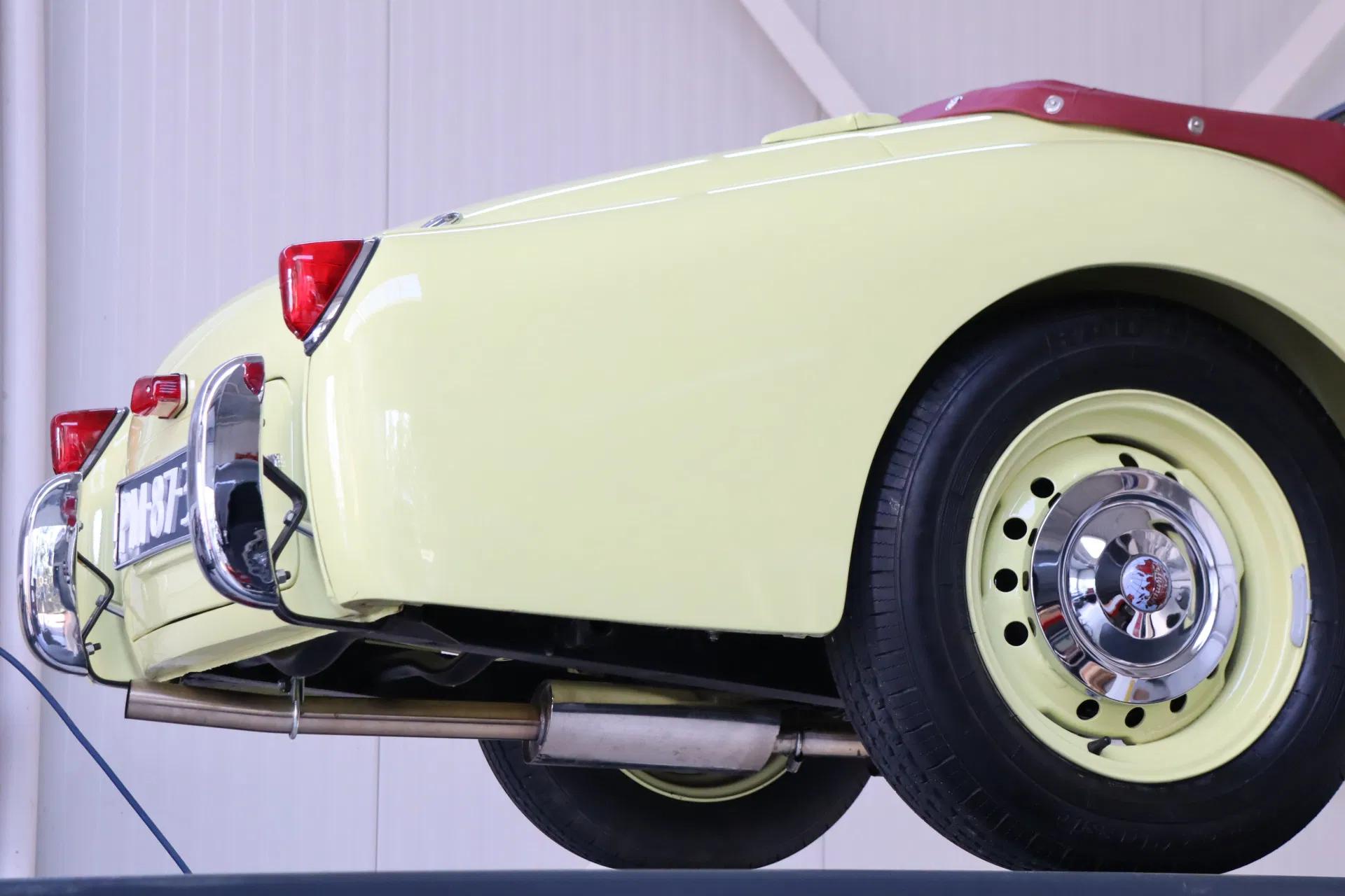 What a sight: the classic look of the TR2 is beautifully accentuated by the “Prime Rose Yellow” colour and contrasts nicely with the burgundy interior. This is an early production “Long-Door” model, recognisable by its long side doors without sills at the bottom. The authentic small grille is also known as the “bomb crater” grille. This is the original model of the Triumph TR series. Naturally, the car is in top condition visually. For safety reasons, a tow hook has been added to the bonnet. The headlights are of the P700 type. The soft top is new and therefore in excellent condition. The wheels are also in very good condition, featuring the distinctive Triumph logo. Many chrome parts on the bodywork, such as on the bonnet and side screens, were originally painted in the colour of the car in the first series of the TR2. Because this was an extra step at the time, it cost more, so these chrome parts were no longer painted in the colour on later models. The car's panel lines are neat.