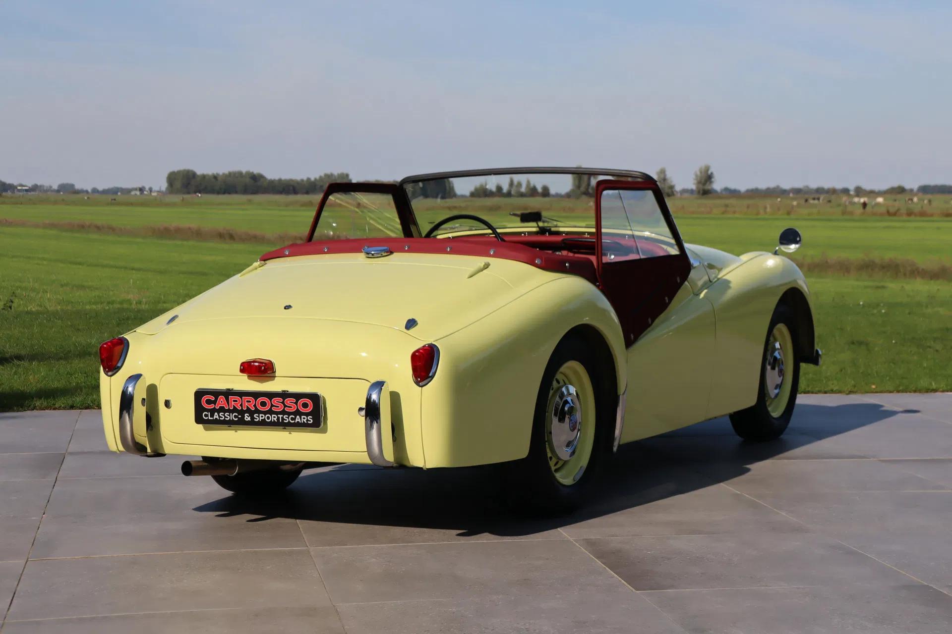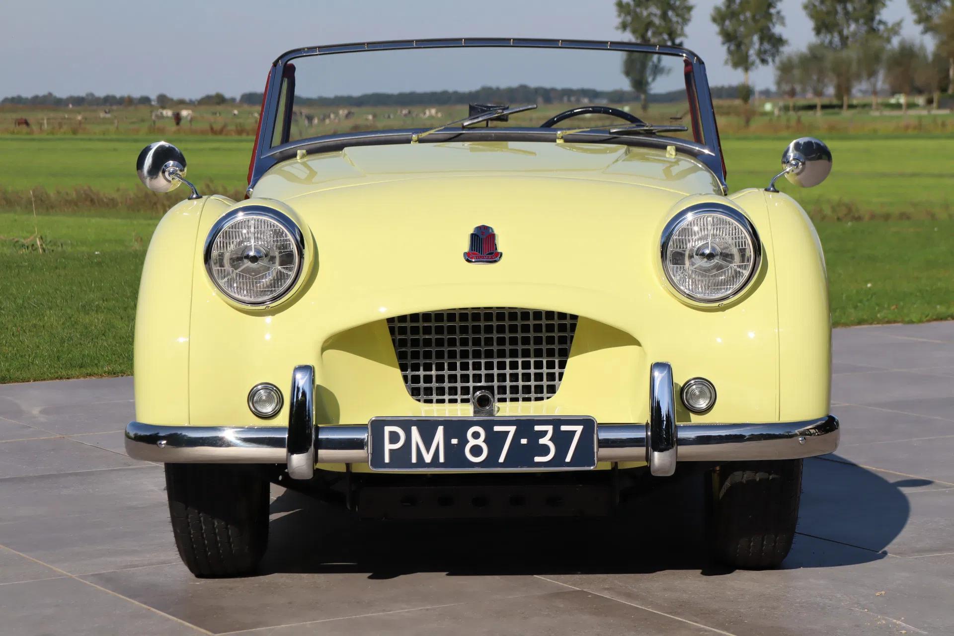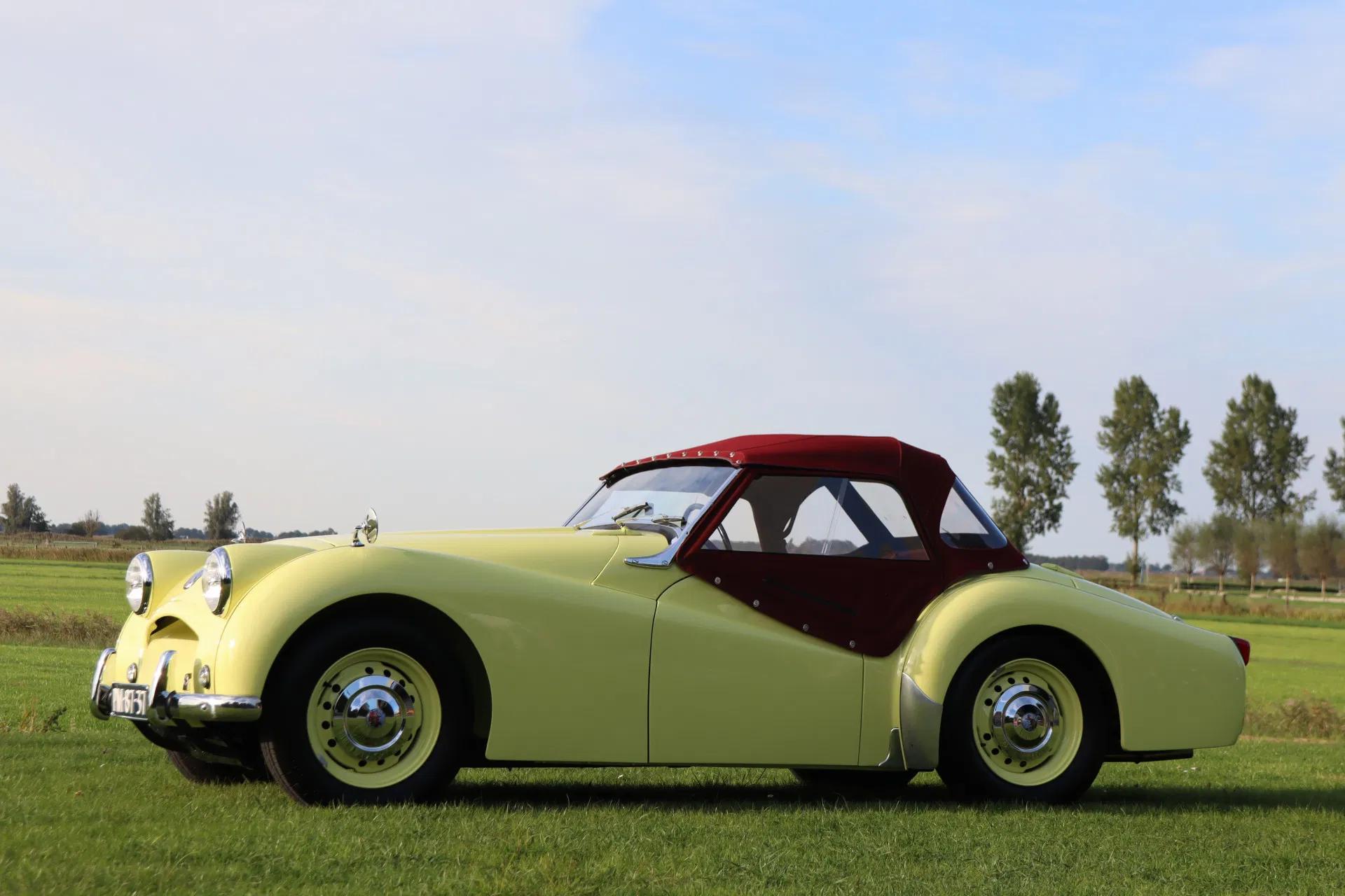 Wat een plaatje: de klassieke uitstraling van de TR2 komt prachtig tot zijn recht in de kleur 'Prime Rose Yellow' en wordt fraai gecontrasteerd met het bordeauxrode interieur. Het betreft hier een vroeg geproduceerd 'Long-Door' model, die te herkennen is aan de lange zijdeuren zonder dorpel aan de onderzijde. De authentieke kleine grille staat ook wel bekend als de 'bomkrater' grille. Het oermodel van de Triumph TR-serie dus. Vanzelfsprekend verkeert de auto optisch in topstaat. In verband met de veiligheid is aan de motorkap een vanghaak toegevoegd. De koplampen zijn van het type P700. De softtop is nieuw, en dus in uitstekende staat. Ook de wielen verkeren in zeer goed staat, met daarin het kenmerkende Triumph logo. Origineel zijn veel chroomdelen op de carrosserie, zoals op de motorkap en zijschermen, bij de eerste serie van de TR2 meegespoten in de kleur van de auto. Omdat dit destijds een extra handeling was kostte dit meer en daarom werden bij latere modellen deze chroomdelen niet meer in de kleur gespoten. De pasnaden van de auto zijn netjes.